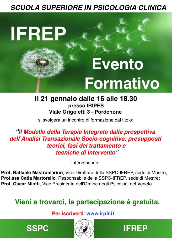 Evento Formativo IFREP – 21 gennaio 2017 – Pordenone Il 21 gennaio 2017 dalle 16:00 alle 18:30 presso IRIPES in Viale Grigoletti 3, Pordenone, si svolgerà un incontro di formazione dal titolo “Il modello della terapia integrata dalla prospettiva dell’Analisi Transazionale Socio-cognitiva: presupposti teorici, fasi del trattamento e tecniche di intervento” (scarica la locandina) Per iscriversi: www.irpir.it